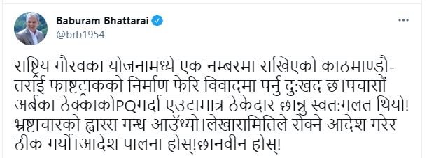 काठमाडौं–तराई फाष्ट ट्रयाकको निर्माण विवादमा पर्नु दुःखद : बाबुराम भट्टराई