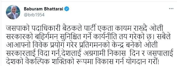 उनले लेखेका छन्, ‘जसपाको पदाधिकारी बैठकले पार्टी एकता कायम राख्दै ओली सरकारको बहिर्गमन सुनिश्चित गर्ने कार्यनीति तय गरेको छ। सबैले आआफ्नो विवेक प्रयोग गरेर प्रतिगमनको केन्द्र बनेको ओली सरकारलाई विदा गर्न,देशलाई अग्रगामी निकास दिन र जसपालाई देशको वैकल्पिक शक्तिको रूपमा विकास गर्न योगदान गरौं!’