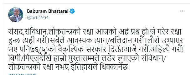 उनले लेखेका छन्, ‘संसद,संविधान,लोकतन्त्रको रक्षा आजको अहं प्रश्न हो ! जे गरेर रक्षा हुन्छ त्यही गरौं । सबैले आवस्यक त्याग/बलिदान गरौं । लौरो उभ्याएर भए पनि ७६(५)को वैकल्पिक सरकार दिउँ ! आजै गरौं, अहिल्यै गरौं ! बिपी/पिएलदेखि हाम्रो पुस्तासम्मले लडेर ल्याएको संविधान/लोकतन्त्रको रक्षा नभए इतिहासले धिक्कार्नेछ !’
