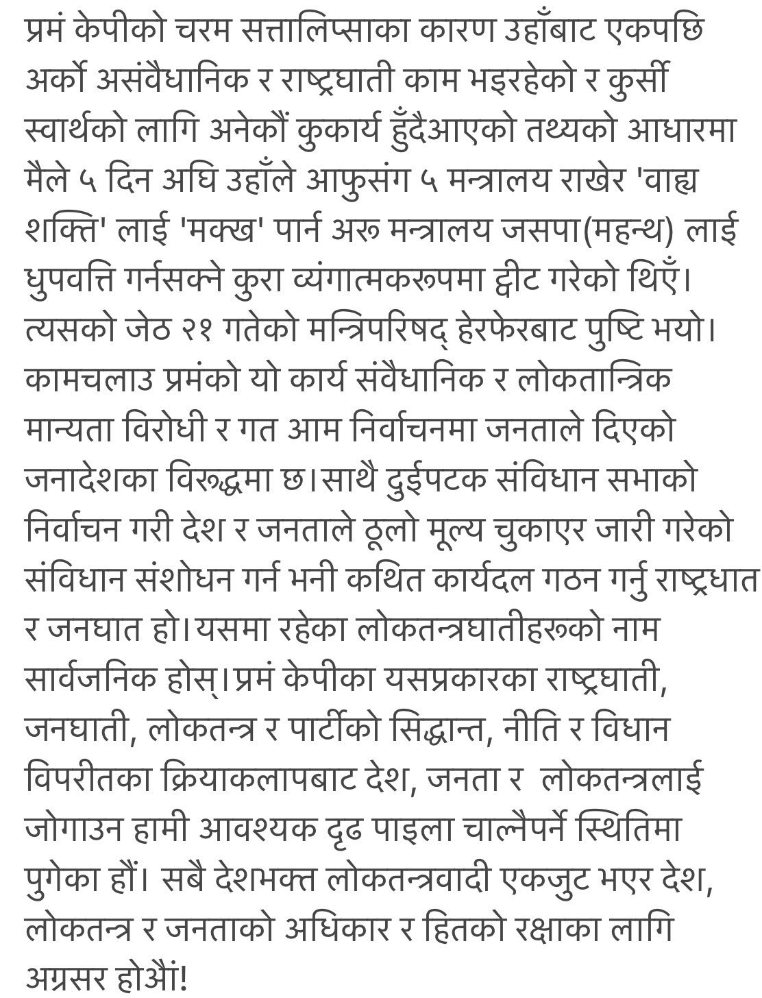 काठमाडौं । नेकपा एमालेका नेता डा.भीम रावलले प्रधानमन्त्री केपी शर्मा ओलीको संवैधानिक, लोकतान्त्रिक मान्यता एवम् राष्ट्रहित विरोधी चरित्र र कार्य जेठ २१ को मन्त्रिपरिषद्को हेरफेरमा अझ छताछुल्ल भएको बताएका छन् ।