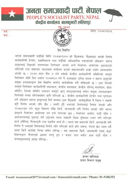 जसपाको प्रचार विभाग प्रमुख डम्बर खतिवडाले शनिबार विज्ञप्ति जारी गरी ९ पुसमा बसेको बैठकले कार्यकारिणी समिति पुनगर्ठनको अधिकार ठाकुरलाई नदिएको प्रष्ट पारेका छन् ।