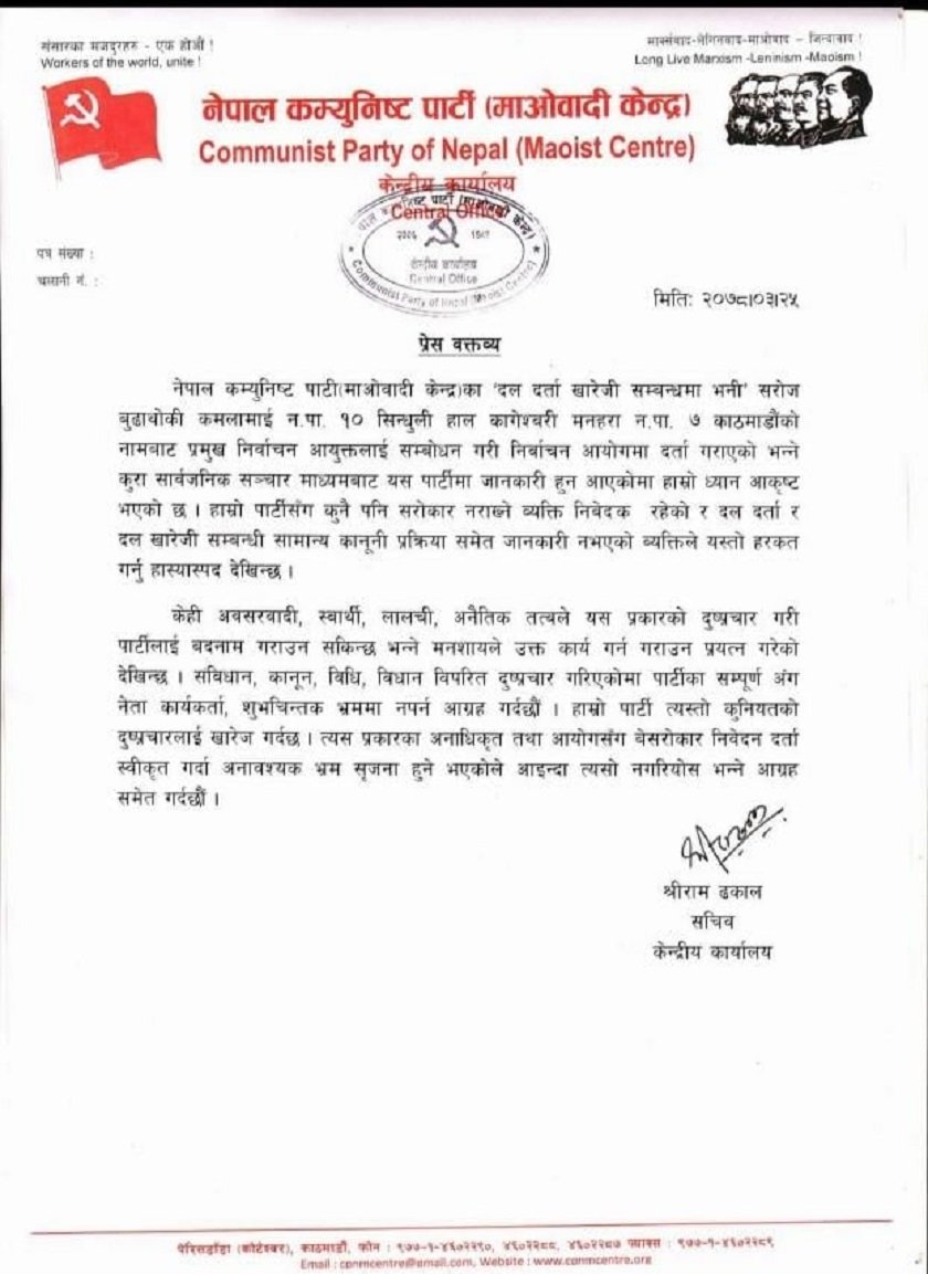 माओवादी केन्द्रीय कार्यालयका कार्यलय सचिव श्रीराम ढकालले शुक्रबार विज्ञप्ति जारी गरी नेकपा माओवादी केन्द्र दल दर्ता खारेजीका लागि सरोज बुढाथोकीले निर्वाचन आयोगमा निवेदन दर्ता गराएको सार्वजनिक भएकोमा पार्टीको ध्यानाकर्षण भएको भन्दै त्यसरी निवेदन दिने व्यक्ति पार्टीमा सरोकार नै नराख्ने भएको स्पस्ट पारेका छन् ।
