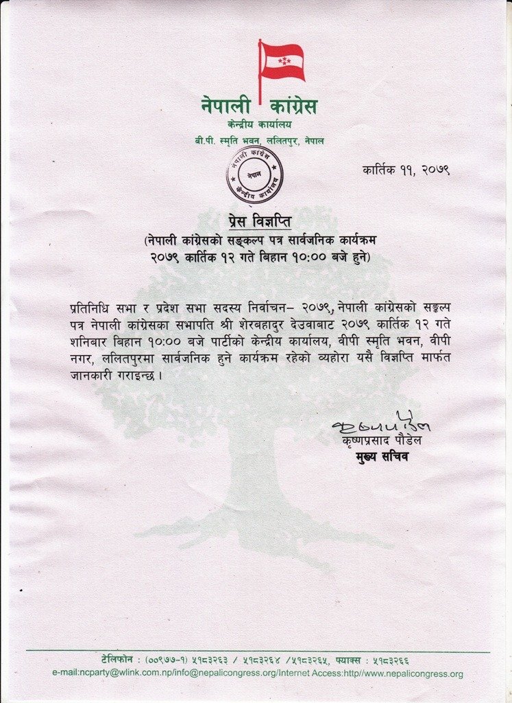 प्रधानमन्त्री शेरबहादुर देउवा, महामन्त्रीद्धय गगन थापा र विश्वप्रकाश शर्मा लगायत शीर्ष नेताहरुको उपस्थितिमा घोषणापत्र सार्वजनिक गरिने भएको छ । महामन्त्री शर्माको संयोजकत्वमा घोषणापत्र तयारी समिति गठन गरिएको थियो ।