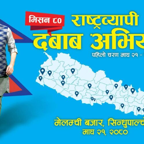 काठमाडौं । राष्ट्रिय स्वतन्त्र पार्टीले रुग्ण र अलपत्र पारिएका विकास योजनाको काम अगाडि बढाउन सरकारको ध्यानाकर्षण गराउने उद्देश्यका साथ आइतबारदेखि दुई महिने ‘राष्ट्रव्यापी दबाब अभियान’ संचालन गर्ने भएको छ । आइतबार बिहान दश बजे मेलम्ची बजारबाट पार्टी सभापति रवि लामछिानेले अभियान सुरु गर्ने कार्यक्रम रहेको छ ।