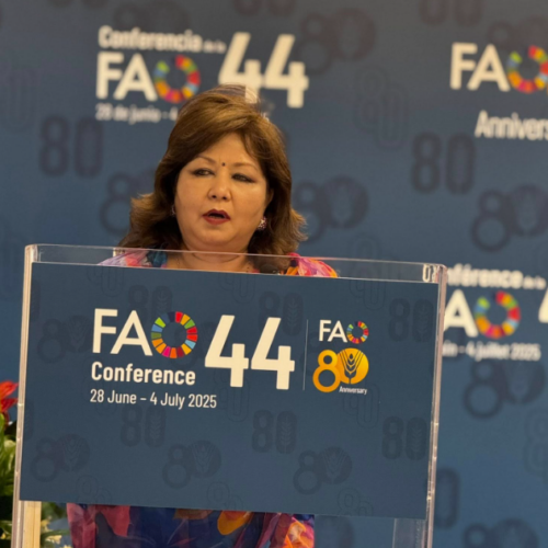 रोममा आयोजित राष्ट्रसङ्घीय खाद्य तथा कृषि सङ्गठनको ४४औँ महासभालाई सोमबार सम्बोधन गर्दै उनले जलवायु परिवर्तनको मार खेपिरहेका नेपाल र यहाँका विशेषगरी हिमाली क्षेत्रका लागि अनुदानमा आधारित अन्तरराष्ट्रिय जलवायु वित्त सुनिश्चित गर्न आग्रह गरिन् ।