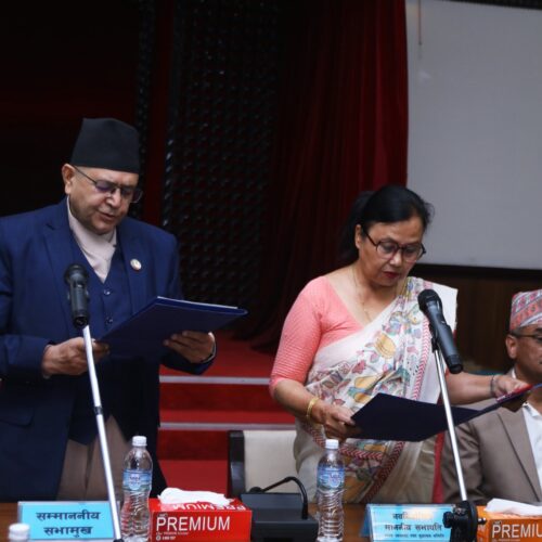 काठमाडौँ । सभामुख देवराज घिमिरेले राज्य व्यवस्था तथा सुशासन समितिका नवनिर्वाचित सभापति ईश्वरीदेवी न्यौपानेलाई पद तथा गोपनीयताको शपथ खुवाएका छन् । सिंहदरबारस्थित सङ्घीय संसद् सचिवालयमा बुधबार आयोजित शपथ ग्रहण कार्यक्रममा सभामुख घिमिरेसमक्ष नवनिर्वाचित सभापति न्यौपानेले शपथ लिएकी हुन् ।