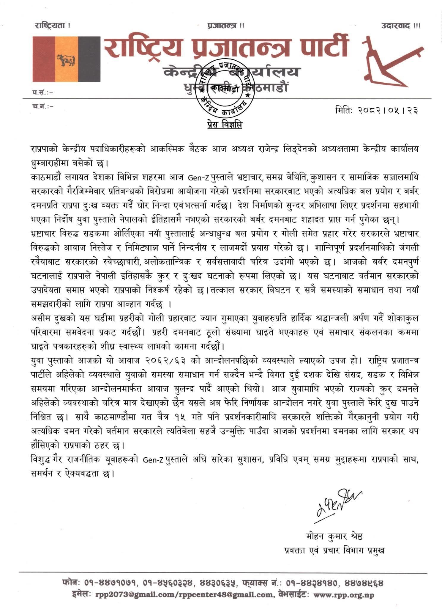 विज्ञप्तिमा भनिएको छ, ‘शान्तिपूर्ण प्रदर्शनमाथिको जंगली रवैयाबाट सरकारको स्वेच्छाचारी, अलोकतान्त्रिक र सर्वसत्तावादी चरित्र उदांगो भएको छ। आजको बर्बर दमनपुर्ण घटनालाई राप्रपाले नेपाली इतिहासकै क्रुर र दुःखद घटनाको रूपमा लिएको छ। यस घटनाबाट वर्तमान सरकारको उपादेयता समाप्त भएको राप्रपाको निश्कर्ष रहेको छ । तत्काल सरकार विघटन र सबै समस्याको समाधान तथा नयाँ समझदारीको लागि राप्रपा आव्हान गर्दछ ।’