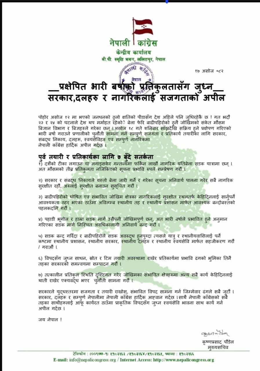 काठमाडौं । नेपाली कांग्रेसले प्रक्षेपित भारी वर्षाको प्रतिकुलतासँग जुध्नका लागि सरकार, दलहरु र नागरिकलाई सजग रहन अपील गरेको छ ।