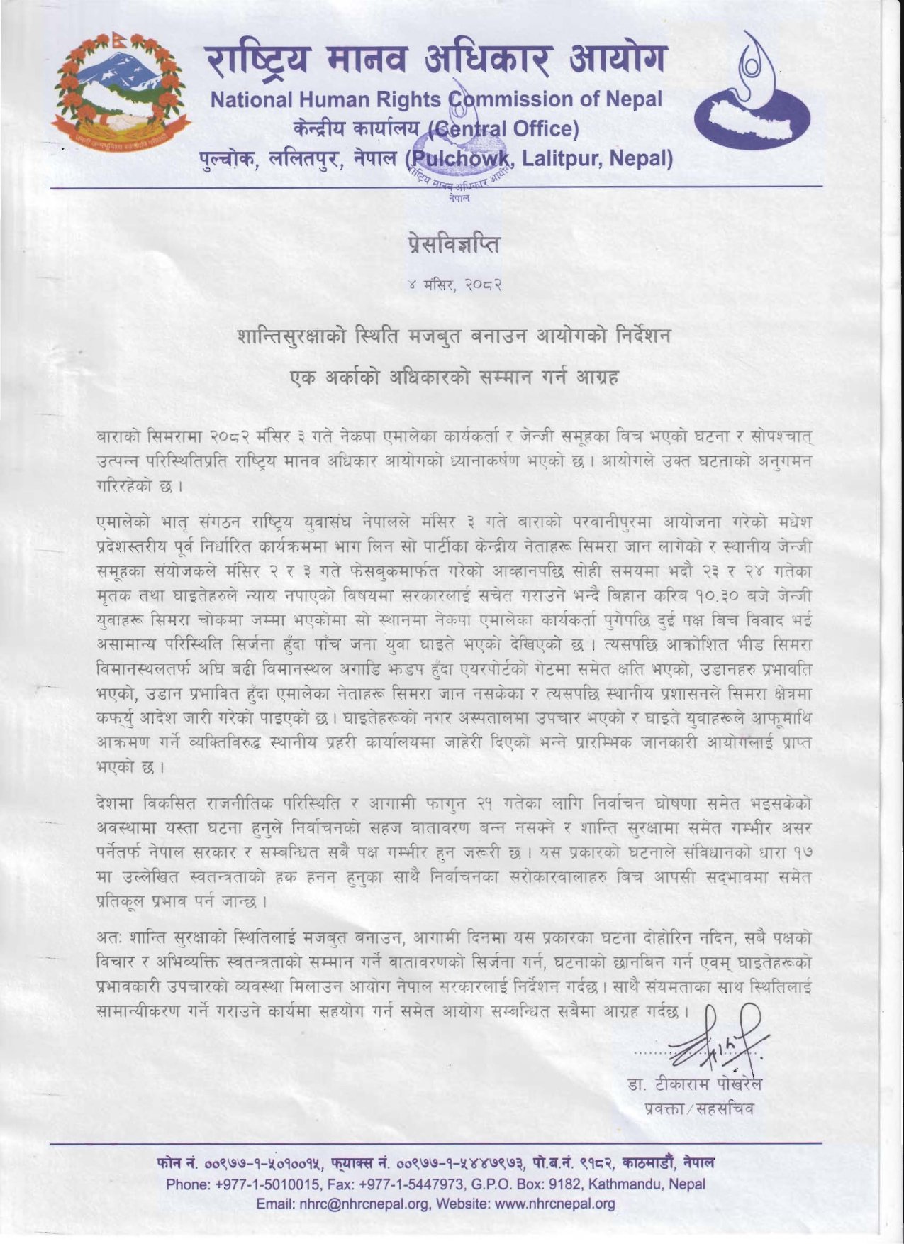 बाराको सिमरामा नेकपा (एमाले)का कार्यकर्ता र ‘जेनजी’बीच झडप भएको सन्दर्भमा आयोगले एकार्काको अधिकारको सम्मान गर्न पनि आग्रह गरेको हो ।
