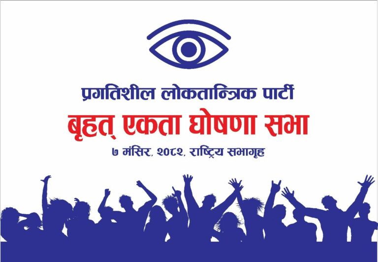 काठमाडौं । नेपाल समाजवादी पार्टी (नयाँ शक्ति), जनार्दन शर्माको प्रगतिशील राष्ट्रिय अभियान र राष्ट्रिय स्वतन्त्र पार्टी (रास्वपा) परित्याग गरेका सन्तोष परियारबीच एकतापछि बनेको प्रगतिशील लोकतान्त्रिक पार्टी आज घोषणा हुँदैछ । राष्ट्रिय सभागृहमा आज मध्यान्ह पार्टी एकता घोषणा कार्यक्रम रहेको छ ।
