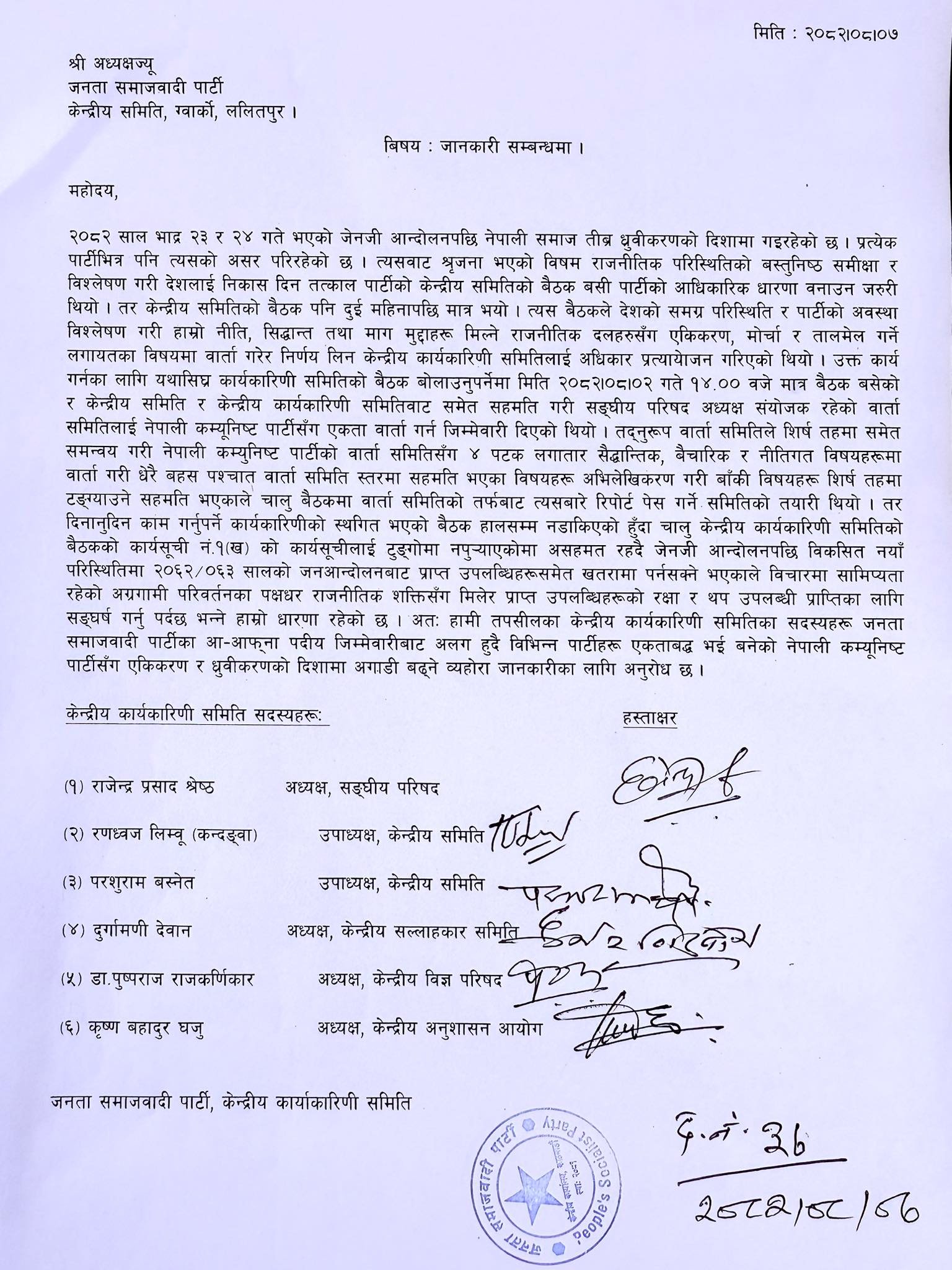 श्रेष्ठसहित ६ नेताले अध्यक्ष अशोक राईलाई पत्र पठाउँदै पार्टीबाट अलग भएको र अब नेकपासँग एकीकरणमा जाने जानकारी गराएका छन् ।