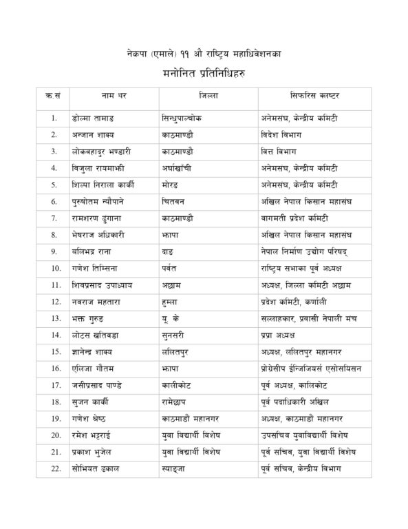 काठमाडौं । नेकपा एमालेले महाधिवेशनका लागि १०८ जना प्रतिनिधि मनोनीत गरेको छ । आजदेखि सुरु हुने पार्टीको ११औँ महाधिवेशनका लागि एमाले १०८ जनाको नाम मनोनीत गरेको हो । शुक्रबार बसेको पार्टी सचिवालय बैठकले मनोनीत प्रतिनिधिको टुङ्गो लगाएको थियो ।