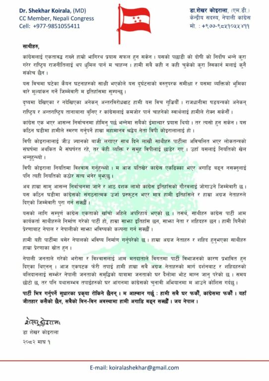 उनले भनेका छन्, ‘अब हाम्रा सामु आसन्न निर्वाचनमा जाने र आठ दशक लामो कांग्रेस इतिहासको गौरवलाई जोगाउने जिम्मेवारी छ । यस कठिन घडीमा कांग्रेसको संगठनात्मक उर्जा प्रस्फुटन भएर मात्र हामी इतिहासले र हाम्रा अग्रज नेताहरुले दिएको जिम्मेवारी पुरा गर्न सक्छौँ । यसको लागि सम्पूर्ण कांग्रेस एकताको खाँचो अहिले अपरिहार्य भएको छ । तसर्थ, साथीहरु कांग्रेस पार्टी आम कार्यकर्ता साथीहरुले निर्माण गरेको पार्टी हो, हाम्रा साझा इतिहाँस छन, साझा नेता र शहिदहरु छन् । हामी यिनैको प्रेरणाबाट नेपाल र नेपालीको साझा भविष्यको कल्पना गर्न सक्छौँ ।’