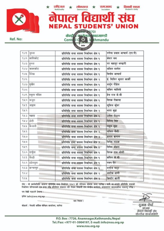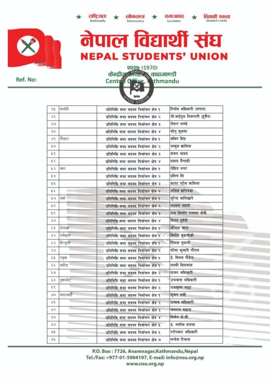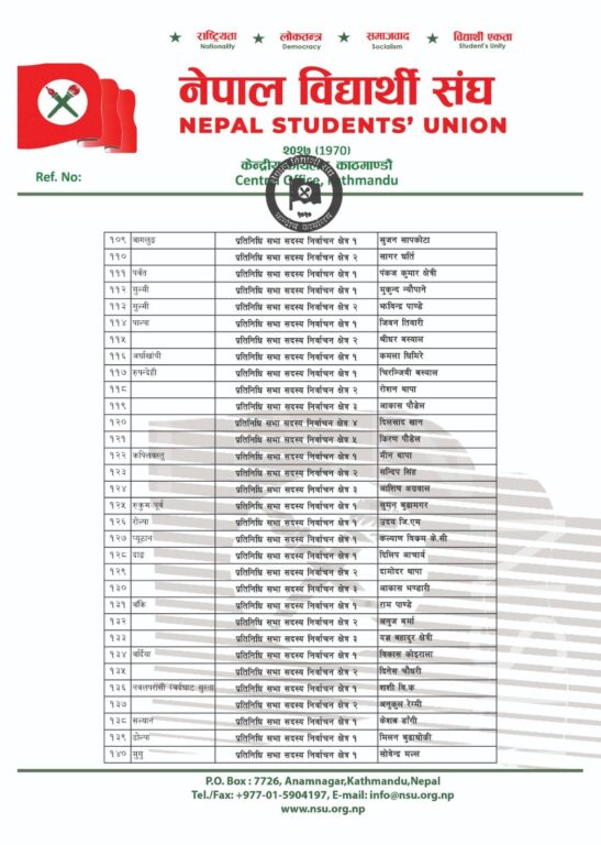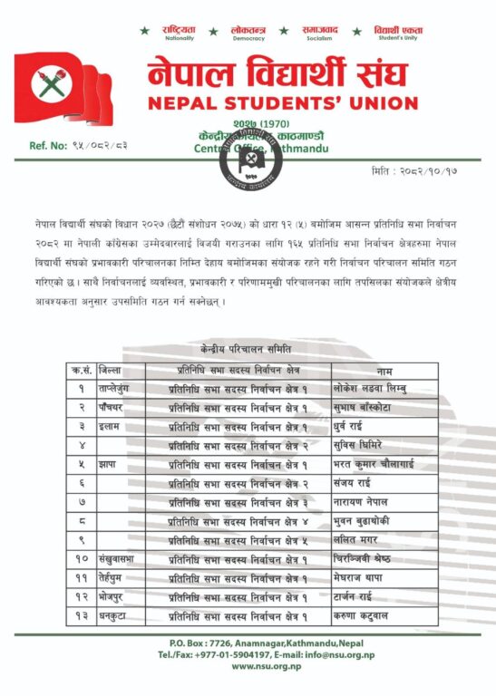 काठमाडौँ । नेपाल विद्यार्थी संघले आसन्न प्रतिनिधिसभा निर्वाचनमा नेपाली कांग्रेसका उम्मेदवारलाई विजयी गराउने उद्देश्यसहित निर्वाचन परिचालन समिति गठन गरेको छ । कांग्रेसका उम्मेदवारलाई विजयी गराउनका लागि १६५ वटै निर्वाचन क्षेत्रमा आफ्नो प्रभावकारी परिचालनका निम्ति समिति गठन गरिएको नेविसंघले जनाएको छ ।