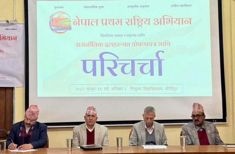 काठमाडौं। नेपाल प्रथम राष्ट्रिय अभियानको आयोजनामा सञ्चालन गरिएको ’निर्वाचन, जनता र राष्ट्रका लागि’ कार्यक्रमको श्रृंखलाअन्तर्गत शनिबार त्रिभुवन विश्वविद्यालय परिसरमा सबै प्रमुख राजनीतिक दलका घोषणापत्रमाथि गहन विमर्श तथा परिचर्चा कार्यक्रम सम्पन्न भएको छ । निर्वाचनको पूर्वसन्ध्यामा आयोजित उक्त कार्यक्रमले चुनावलाई केवल प्रतिनिधि चयनको प्रक्रियामा सीमित नगरी नीतिगत बहस र राष्ट्रनिर्माणको मार्गदर्शनसँग जोड्ने प्रयास गरेको आयोजकले जनाएको छ ।