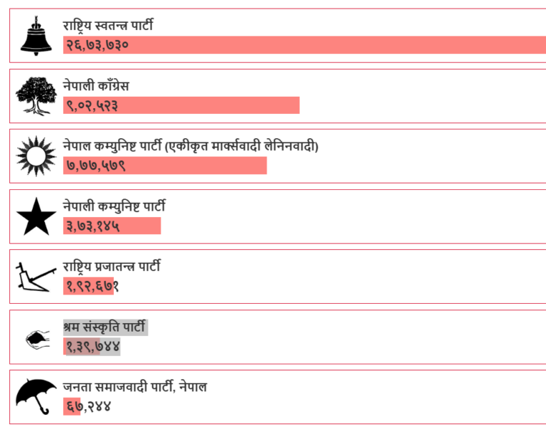 कांग्रेसले ९ लाख २ हजार ५२३ मत पाएको छ । नेकपा एमालेले ७ लाख ७७ हजार ५७९ मत पाएको छ । त्यसैगरी नेपाली कम्युनिस्ट पार्टी (नेकपा)ले ३ लाख ७३ हजार १४५ मत पाएको छ ।
