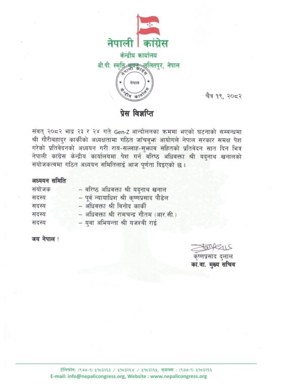 काठमाडौँ । नेपाली कांग्रेसले जेनजी आन्दोलन जाँचबुझ आयोगको प्रतिवेदन अध्ययन गर्न समिति गठन गरेको छ । वरिष्ठ अधिवक्ता यदुनाथ खनालको नेतृत्वमा पाँच सदस्य अध्ययन समिति गठन गरिएको कांग्रेसका कार्यवाहक मुख्य सचिव कृष्णप्रसाद दुलालले जानकारी दिएका छन् ।