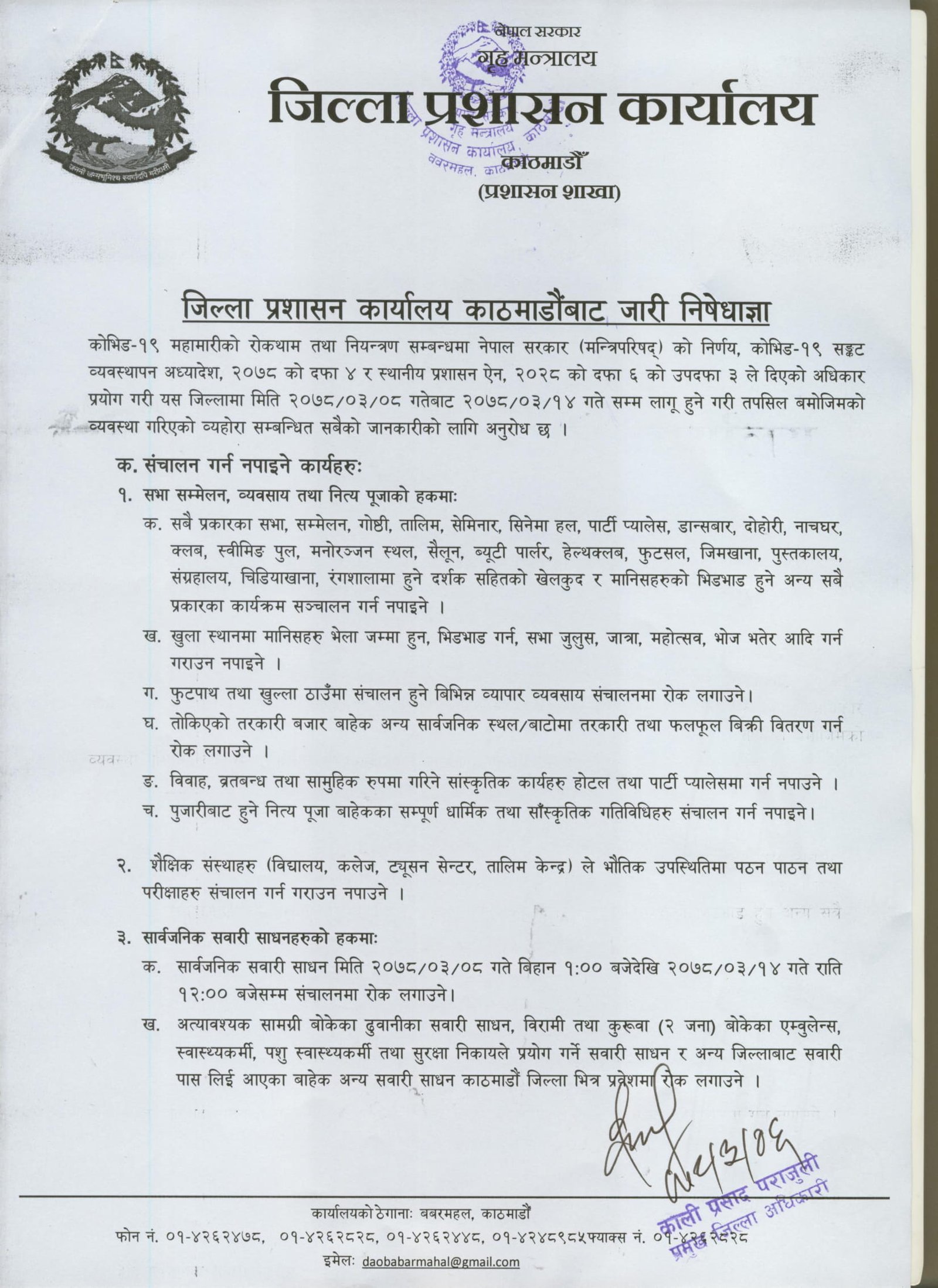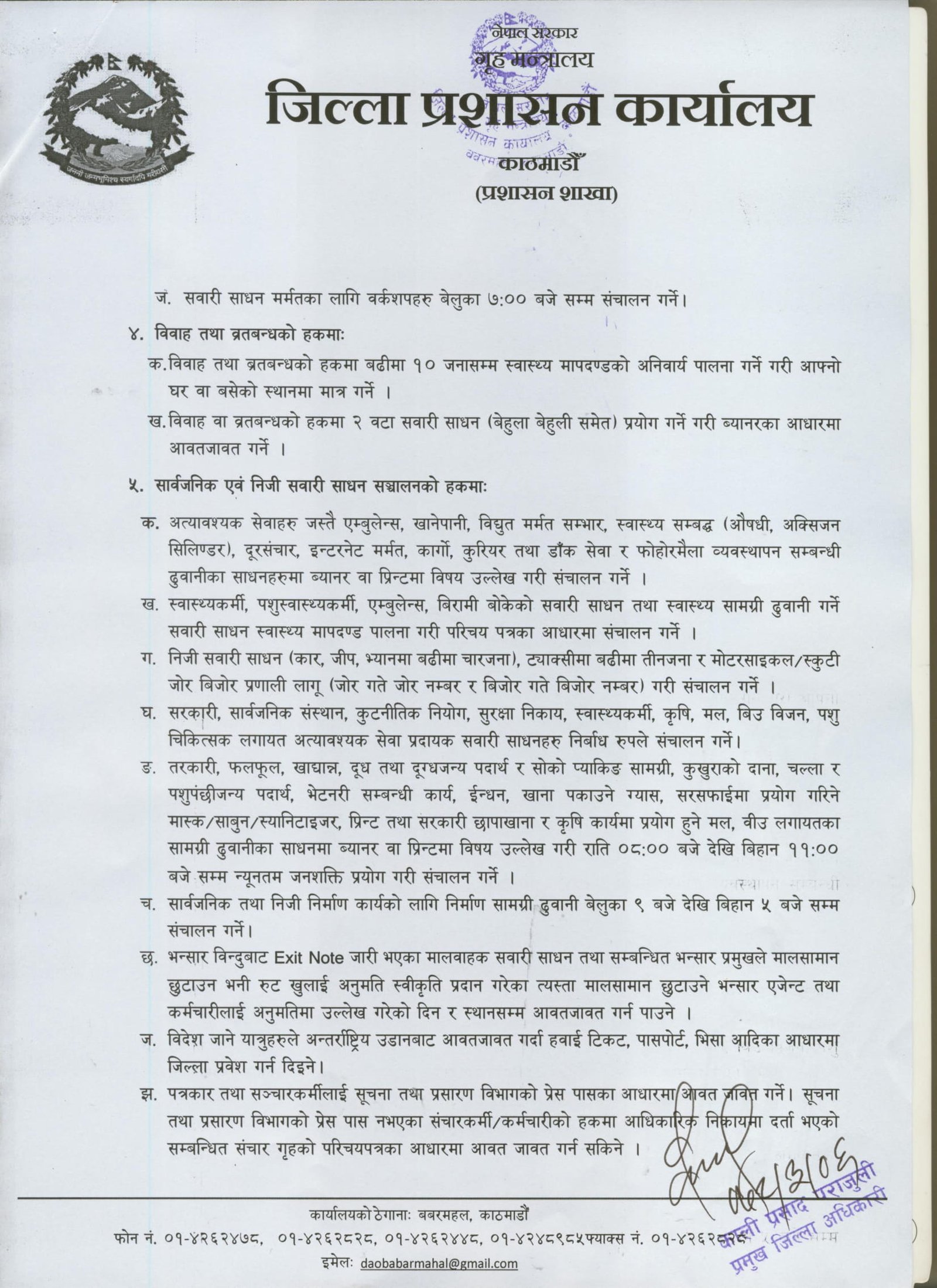 काठमाडौंका प्रमुख जिल्ला अधिकारी कालिप्रसाद पराजुलीका अनुसार थपिएको निषेधाज्ञामा निजी सवारी साधन जोर–विजोर प्रणालीमा चलाउन पाइनेछ भने बार अनुसार पसल सञ्चालन गर्न पनि पाइनेछ ।