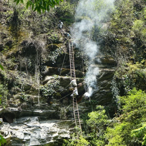 म्याग्दीको अन्नपूर्ण गाउँपालिका–५ स्वाँतको छहरेभिरमा मङ्गलबार डोरीमा झुण्डिएर भिर माहुरीको महशिकार गर्दै शिकारी । स्वाँतका भिरपहरामा डोरीमा झुण्डिएर गरिने मह शिकारको याम सुरु