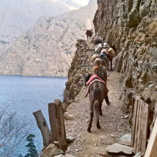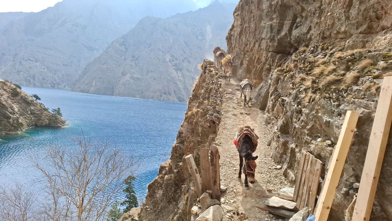डोल्पाको सदरमुकाम दुनैबाट उपल्लो डोल्पाको शे–फोक्सुण्डो गाउँपालिका–८ स्थित फोक्सुण्डो तालको किनारै किनारै हिँडेर गाउँपालिकाको केन्द्र रहेको वडा नं ३ साल्दाङ जाँदै गरेका घोडा । यहाँ ढुवानीको प्रमुख माध्यमका रुपमा घोडालाई लिइन्छ ।