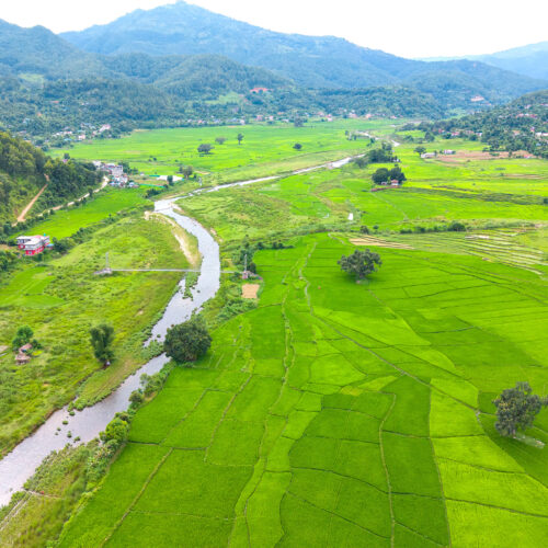 तनहुँको भानु नगरपालिका ४ र ५ स्थित चुँदीफाँटमा रोपाइ सकिएपछि हरियाली छाएको धानखेती । चुँदीफाँट धान उत्पादनका लागि जिल्लाकै पकेट क्षेत्रका रूपमा चिनिन्छ। तस्बिर : सागर गिरी / रासस