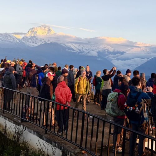 चराहरूको चिरबिरसँगै विस्तारै हिमाल खुल्न थाल्छ । घामको पहिलो झुल्का हिउँचुचुरोमा पर्दाको दृश्यले मोहित तुल्याउँछ । छिनभरमै घामका कलिला किरण पुनहिलमा छाइसक्छन् । हिमालको काखबाट सूर्य उदाएको दृश्यले कसलाई पो नलोभ्याउला र सूर्योदयको मनप्रिय दृश्यलाई आँखादेखि क्यामेरासम्म कैद गर्नेहरूको तछाडमछाड देखिन्छ । विदेशीहरू आफ्नै देशको झण्डा ओडेर तस्बिर खिचिरहेका भेटिन्छन् भने नेपालीहरू चन्द्र–सूर्य अङ्कित झण्डासहित ।