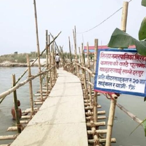 सिरहा । हुलाकी राजमार्गअन्तर्गत सिरहा र धनुषालाई जोड्ने कमला नदीमा पुल निर्माण सुरु भएको १४ वर्ष बितिसक्दा पनि काम अलपत्र छ । पुल नबन्दा सिरहा र धनुषावासी नदी तर्नका लागि स्थानीय युवाको सक्रियतामा बनाइएको कामचलाउ काठेपुलको सहारा लिन बाध्य छन् । यही काठेपुल तरेबापत स्थानीयले प्रतिव्यक्ति २० शुल्क तिर्नुपरेको छ ।