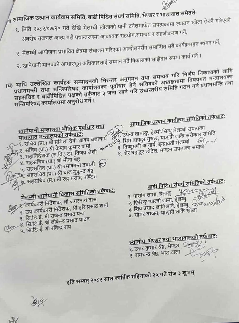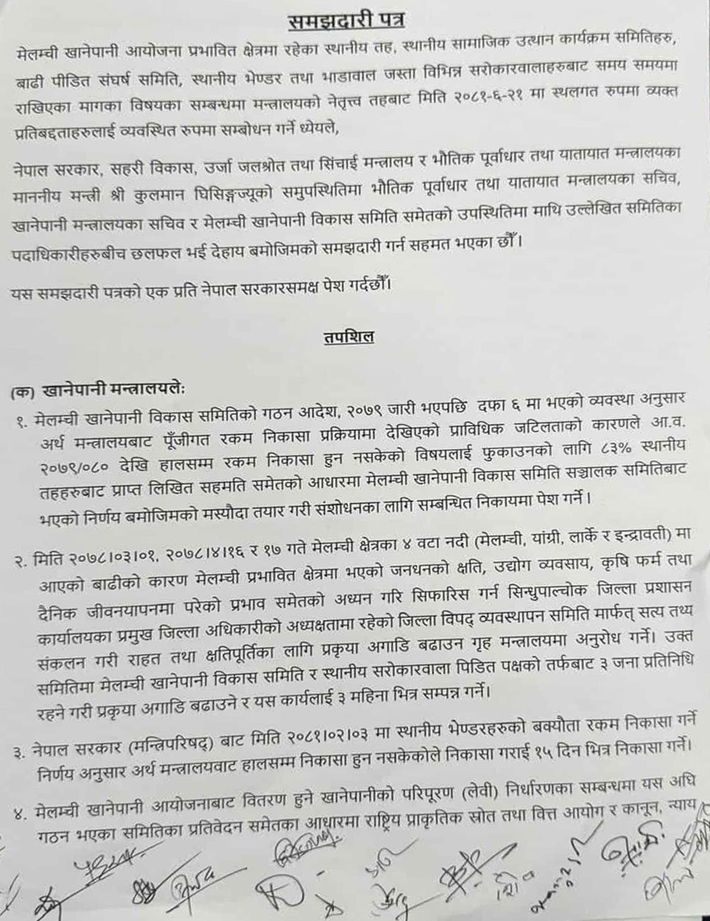 छलफलमा विभागीय मन्त्री कुलमान घिसिङसँगै भौतिक पूर्वाधार तथा यातायात मन्त्रालयका सचिव, खानेपानी मन्त्रालयका सचिव, मेलम्ची खानेपानी विकास समितिका पदाधिकारी र सरोकारवालाहरूको उपस्थितिमा समझदारीपत्रमा हस्ताक्षर सम्पन्न गरी विवाद समाधान गरिएको हो।