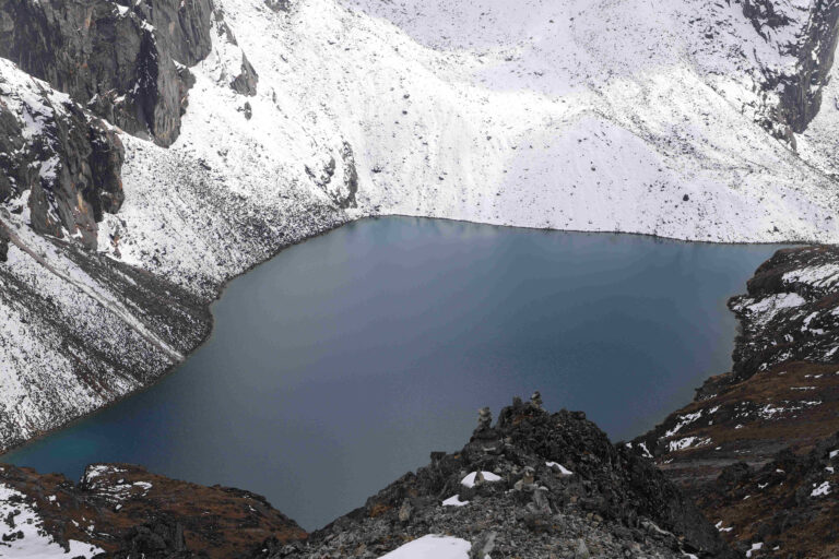 समुद्री सतहदेखि करिब पाँच हजार ३०० मिटर उचाइमा अवस्थित ताप्लेजुङको फक्ताङलुङ गाउँपालिका–७ सिङ्जेमा रहेको स्याम्दो पोखरी । यस क्षेत्र आसपासमा अन्य साना पोखरीहरू पनि रहेका छन् । तस्बिरः दिलकुमार लिम्बू/रासस
