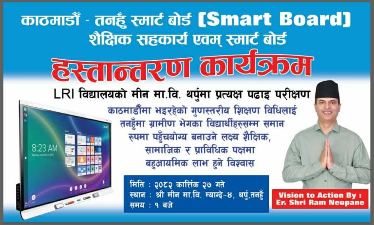 तनहुँ । तनहुँका ६ वटा सामुदायिक विद्यालयमा प्रविधिमैत्री शिक्षा विस्तार गर्न ‘स्मार्ट बोर्ड शैक्षिक सहकार्य कार्यक्रम’ सुरु गरिएको छ । इन्जिनियर श्रीराम न्यौपानेको भिजन टु एक्सन प्लान(Vision to Aciton Plan) अन्तर्गत सुरु गरिएको यस कार्यक्रममार्फत काठमाडौंका प्रतिष्ठित विद्यालयका गुणस्तरीय कक्षाहरू अब तनहुँका विद्यार्थीहरूले प्रत्यक्ष, अनलाइन तथा अफलाइन माध्यमबाट हेर्न र सिक्न पाउने भएका छन् ।