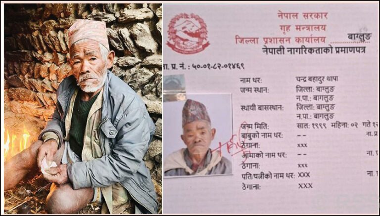 बागलुङ। बागलुङ नगरपालिका–१० भकुण्डेमा बस्दै आएका एक ८३ वर्षीय वृद्धले नागरिकता प्राप्त गर्नुभएको छ । २०८१ फागुन २ गते राष्ट्रिय समाचार समितिमा ‘बूढेसकालमा नाम खोजिरहेका धान्द्रुके बाजे’ शीर्षकमा समाचार प्रकाशित भएपछि उनी नागरिकताबाट वञ्चित भएको बारेमा उजागर भएको थियो ।