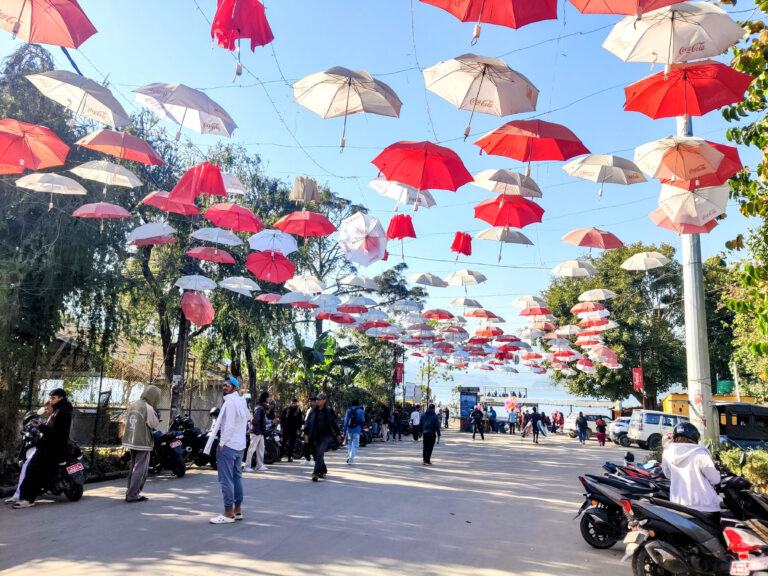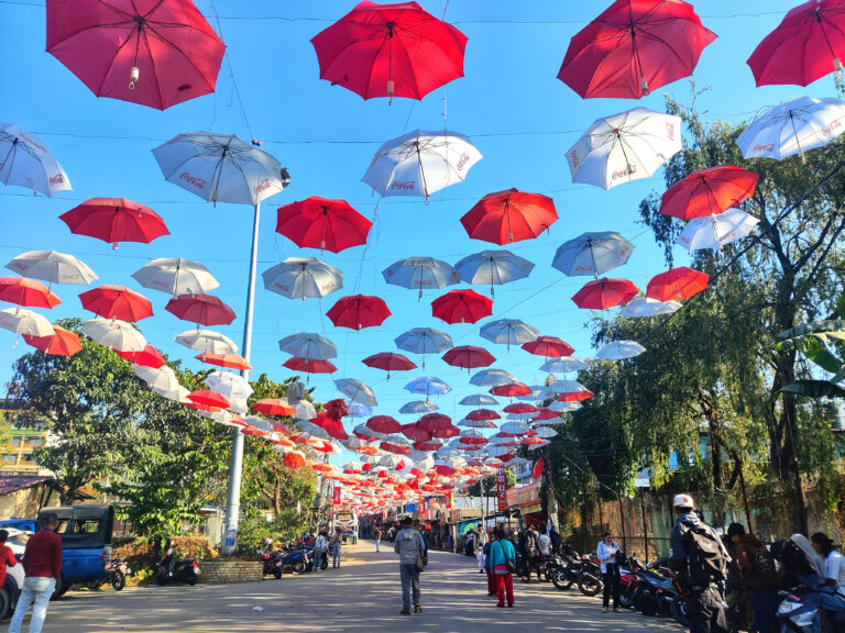 पोखरा महानगरपालिका-६स्थित हल्लन चोकमा पर्यटकलाई आकर्षण गर्न सजाइएका रङ्गीचङ्गी छाता । तस्बिर : राधिका कँडेल / रासस