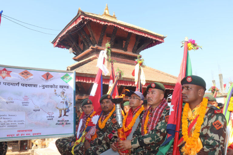 नुवाकोट । नेपाल एकीकरणका क्रममा तत्कालीन राजा पृथ्वीनारायण शाह हिँडेको बाटो पछ्याउँदै पदयात्रा सुरु गरेको नेपाली सेनाको ‘एकीकरण टर्च र्याली’को नवाकोटस्थित साततले दरबार, भैरवीदेवी मन्दिरमा स्वागत गरिएको छ ।