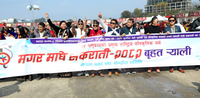 त्यसपघि नेपाल मगर संघ केन्द्रीय समितिको आयोजना र विभिन्न संघसंस्थाको अगुवाइमा काठमाडौंमा उपत्यकामा बस्दै आएका मगरहरूले भृकुटीमण्डपबाट टुँडिखेलसम्म सांस्कृतिक र्याली निकालेका थिए । माघे सङ्क्रान्ति मगर जातिका कुलदेवताको पूजाआजा गरिन्छ ।