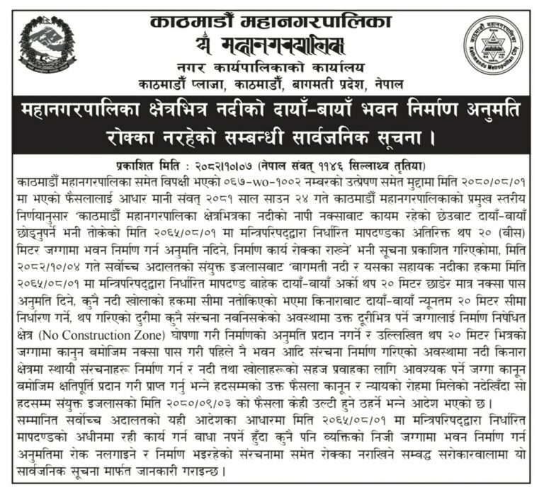 काठमाडौँ । काठमाडौँ महानगरपालिकाले नदीको नापी नक्साबाट कायम रहेको छेउबाट २० मिटर दायाँ–बायाँ छोड्नु नपर्ने गरि यसअघि गरेको रोक्का फुकुवा गरेको छ ।