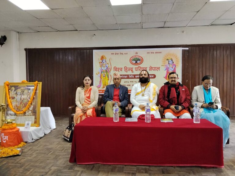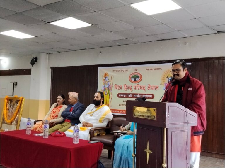 काठमाडौँ । विश्व हिन्दू परिषद् नेपालले धर्मरक्षा निधि समर्पण कार्यक्रम आयोजना गरेको छ । शुक्रबार काठमाडौँमा कार्यक्रम आयोजना गरिएको हो ।कार्यक्रमको उद्देश्य हिन्दू धर्म, संस्कृति तथा परम्पराको संरक्षण र संवद्र्धनका लागि आवश्यक धन एवं जनसहभागितामार्फत धर्म रक्षाको भावना सुदृढ बनाउनु रहेको आयोजकले जनाएको छ ।