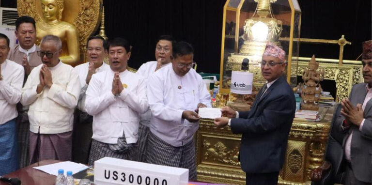 म्यान्मारका लागि नेपालका राजदूत हरिश्चन्द्र घिमिरेले म्यान्मारको मण्डले सहरको दक्षिण–पश्चिम क्षेत्रमा अवस्थित महामुनी पगोडा परिसरमा हालै आयोजित समारोहमा पगोडाका महासचिव थान उलाई तीन लाख अमेरिकी डलरको चेक हस्तान्तरण गरेको याङ्गुनस्थित नेपालको राजदूतावासले जनाएको छ ।