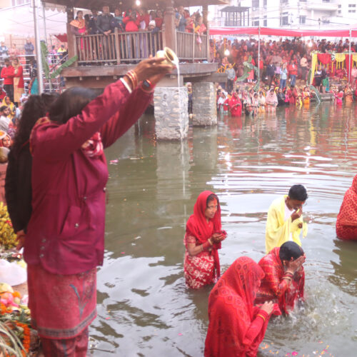 नेपाल र भारतका मिथिला क्षेत्रमा गत आइतबार चतुर्थी तिथिदेखि धार्मिक विधिपूर्वक सुरु भएको चारदिने चैती छठ उत्सवको आज मुख्य दिन षष्ठी तिथिको साँझ विभिन्न जलाशयमा पसेर व्रतालुले अस्ताउँदो सूर्यलाई अर्घ दिँदै चैती छठ पर्व मनाइँदै छ ।