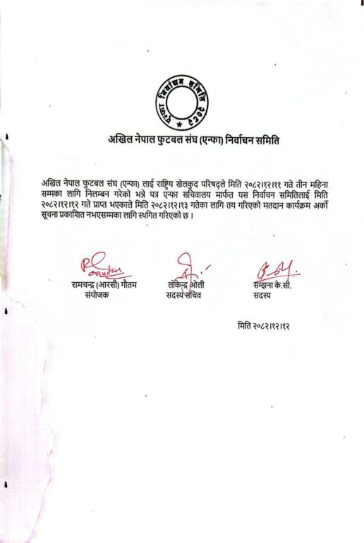 एन्फाले निलम्बन गरेको पत्र पाएपछि तत्कालका लागि चुनाव स्थगित गरिएको निर्वाचन समितिले जनाएको छ।