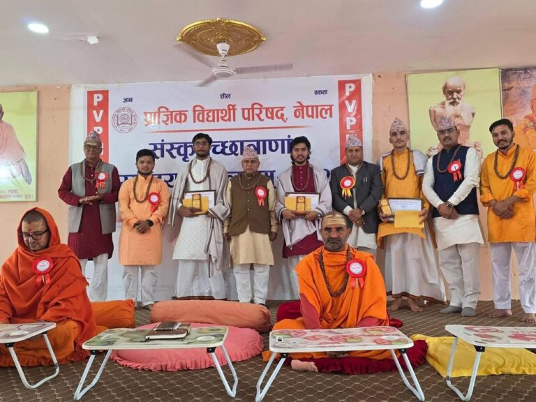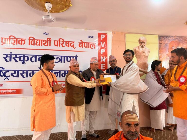 काठमाडौं । संस्कृत सम्मेलनमा उत्कृष्ट विद्यार्थीलाई नारायणी तुलसीराम, भोजराज ढकाल स्मृति पुरस्कार प्रदान गरिएको छ । बिहीबार नेपालको आध्यात्मिक राजधानी तथा संस्कृत शिक्षाको प्रमुख केन्द्रका रूपमा परिचित देवघाट धाममा प्राज्ञिक विद्यार्थी परिषद् नेपाल संस्कृत आयाम कार्य अन्तर्गत तेस्रो राष्ट्रिय संस्कृत सम्मेलनमा पुरस्कार वितरण गरिएको हो ।