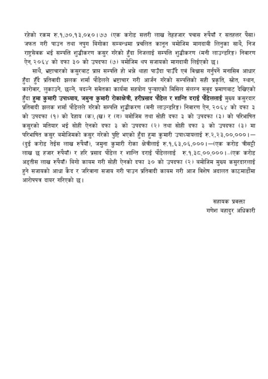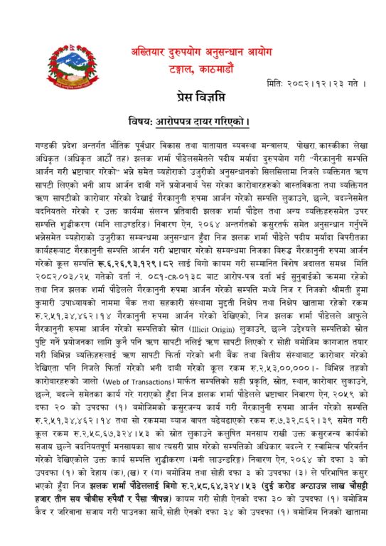 काठमाडौं । गण्डकी प्रदेशको भौतिक पूर्वाधार विकास तथा यातायात व्यवस्था मन्त्रालय, पोखराका निलम्बित लेखा अधिकृत झलक शर्मा पौडेलसहित पाँच जनाविरुद्ध सम्पत्ति शुद्धीकरण अभियोगमा मुद्दा दायर भएको छ ।