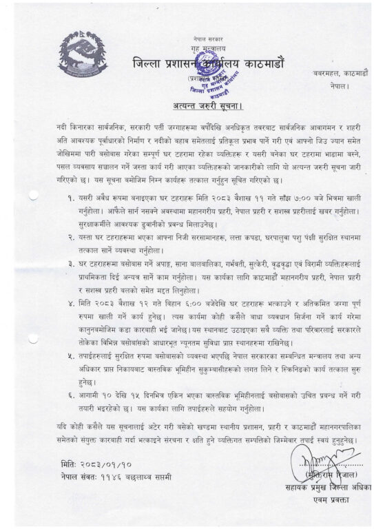 सहायक प्रमुख जिल्ला अधिकारी मुक्तिराम रिजालद्वारा आज जारी अत्यन्त जरुरी सूचनामा सार्वजनिक आवागमन र सहरी अतिआवश्यक पूर्वाधारको निर्माण र नदीको बहावसमेतलाई प्रतिकूल प्रभाव पार्नेगरी एवं आफ्नो जीउज्यानसमेत जोखिममा पारी बसोबास गरेका सम्पूर्ण घरटहरा तथा घरटहरामा रहेका व्यक्तिहरूलाई यस्तो आग्रह गरिएको हो ।