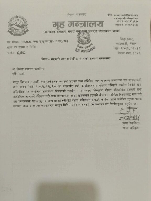 पत्रमा भनिएको छ, ‘प्रस्तुत विषयमा सरकारी तथा सार्वजनिक जग्गाको संरक्षण तथा अभिलेख व्यवस्थापनका सम्बन्धमा यस मन्त्रालयको च.नं. ५५१ मिति २०८२/१२/२० को पत्रमार्फत तहाँ कार्यालयहरूमा परिपत्र गरिएको व्यहोरा विदितै छ । उल्लिखित पत्र बमोजिम सम्बन्धित निकायको सहयोग र समन्वयमा जिल्लामा रहेका अतिक्रमित सरकारी तथा सार्वजनिक जग्गाको पहिचान गरी उक्त जग्गाहरूमा रहेको अतिक्रमण हटाउने योजना सम्बन्धित निकायबाट माग गरी यस मन्त्रालयमा पठाउनुहुन र मन्त्रालयको स्वीकृति पश्चात् अतिक्रमण हटाउने कार्यका लागि यथोचित सुरक्षा प्रबन्ध लगायत अन्य आवश्यक सहजीकरण गर्नुहुन मिति २०८३/०१/१६ (सचिवस्तर) को निर्णायानुसार अनुरोध छ ।’