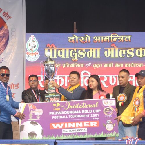 भोजपुर । पौवादुङमा गोल्ड कप दोस्रो संस्करणको उपाधि राजगढ फुटबल क्लब झापाले जितेको छ । बुधबार भएको फाइनल खेलमा तिवारीभञ्याङ फुटबल क्बललाई ४–३ गोल अन्तरले पराजित गर्दै राजगढले उपाधि जितेको हो ।