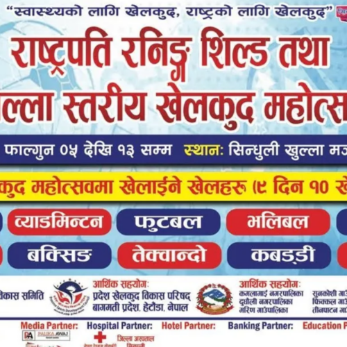 सिन्धुली । जिल्ला खेलकुद विकास समिति, सिन्धुलीको आयोजनामा यही फागुन ५ देखि १३ गतेसम्म प्रथम खेलकुद महोत्सव, २०८१ हुने भएको छ ।
