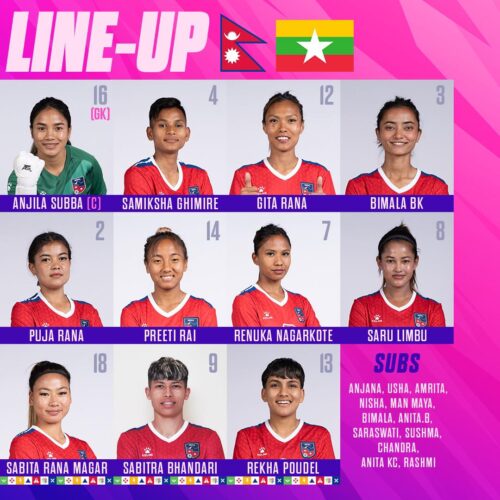 म्यानमारविरुद्ध फाइनल खेल्ने नेपालको प्लेइङ ११ मा कप्तान एञ्जिला तुम्बापो सुब्बा र रेखा पौडेल फर्किएका छन् । त्रिपुरेश्वरस्थित दशरथ रङ्गशालामा आज साँझ ६ बजे म्यानमारसँग प्रतिस्पर्धा गर्दै छ । यसअघि लिग चरणको अन्तिम खेलमा नेपाल र म्यानमार २–२ गोलको बराबरीमा रोकिएका थिए ।