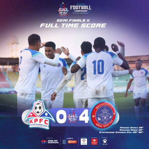 काठमाडौं । आयोजक केपी एफसीलाई हराउँदै मछिन्द्र एफसी जारी केपी ओली कप फुटबल प्रतियोगिताको फाइनलमा प्रवेश गरेको छ ।