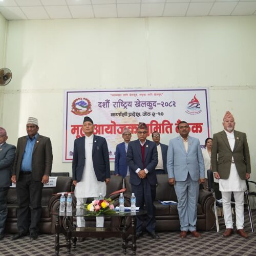 काठमाडौँ, २० फागुनः कर्णाली प्रदेशमा हुने दशौँ राष्ट्रिय खेलकुदको मूल आयोजक समितिको पहिलो बैठक मंगलबार बसेको छ । राष्ट्रिय खेलकुद परिषद् (राखेप) का अध्यक्ष युवा तथा खेलकुदमन्त्री तेजुलाल चौधरीको अध्यक्षतमा सातदोबाटोस्थित अन्तर्राष्ट्रिय खेलकुद परिसरमा बसेको बैठकले विभिन्न चार बुँदे निर्णय गरेको छ ।