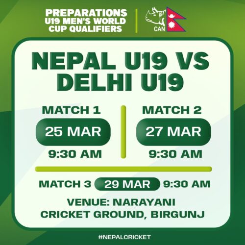 काठमाडौँ । आइसिसी यु–१९ पुरुष विश्वकप क्रिकेट प्रतियोगिता छनोटको तयारीमा नेपालले भारतको प्रान्तीय टिम दिल्लीसँग अभ्यास खेल खेल्ने भएको छ ।