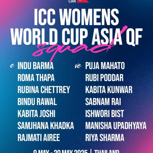 काठमाडौँ । नेपाल क्रिकेट संघ (क्यान) ले आइसीसी महिला टी–२० विश्वकपको एशिया छनौट खेल्ने राष्ट्रिय टोलीको घोषणा गरेको छ । क्यानले शुक्रबार इन्दु बर्माको कप्तानीमा १४ सदस्यीय टोली घोषणा गरेको हो ।